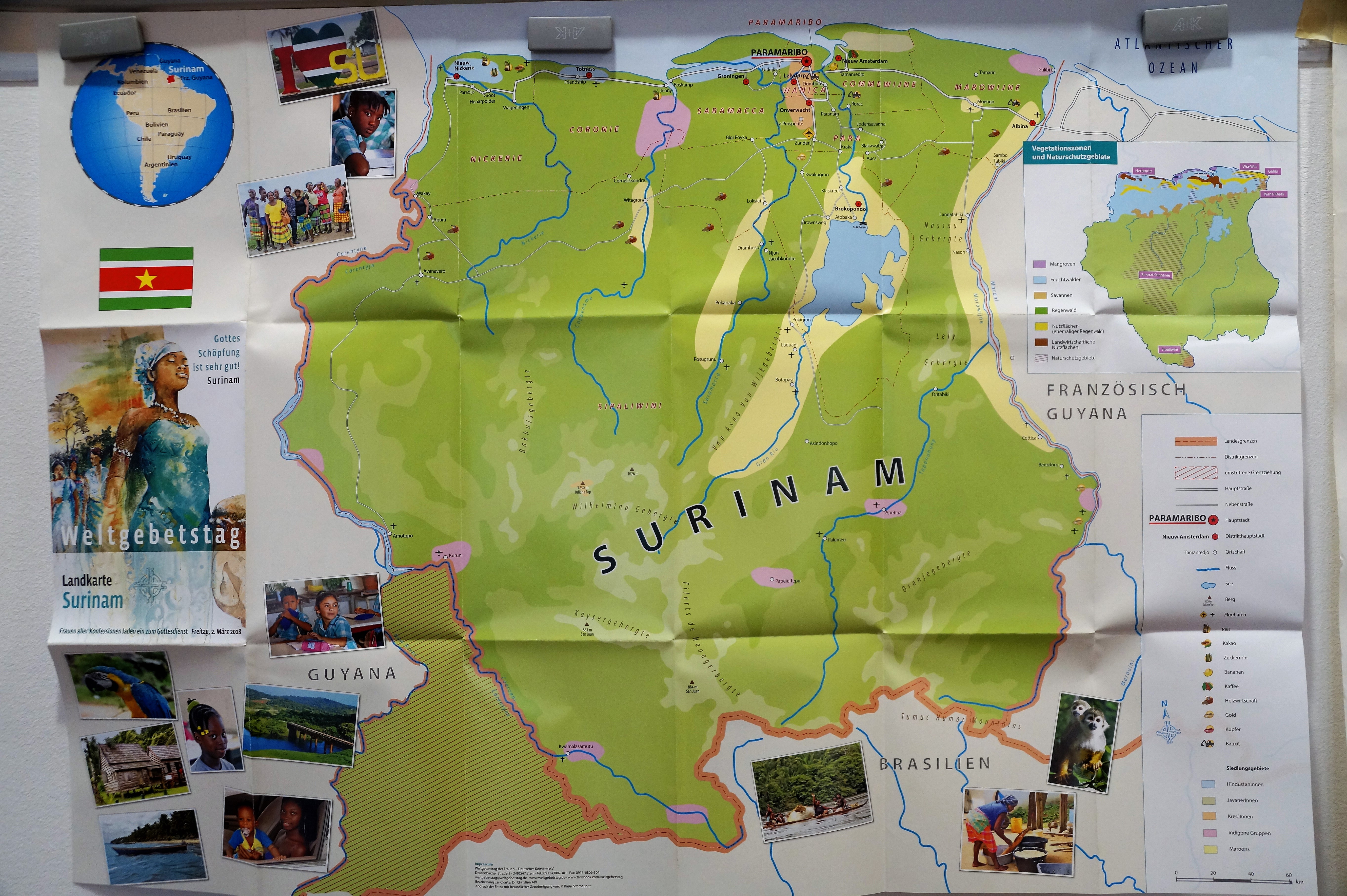 Die Frauen erfuhren mehr über das wenig bekannte Schwerpunktland Surinam, das sich nördlich von Brasilien zwischen den beiden Guayanas befindet. Dieses südamerikanische bzw. karibische Land war bis 1975 eine niederländische Kolonie. Das Land ist ein gutes Beispiel für das Zusammenleben unterschiedlicher Kulturen und Religionen. Cornelia Marschall, Projektreferentin vom Weltgebetstag Deutschland, mit dem gemeinsam mit dem Weltgebetstag Schweiz zwei Projekte in Surinam unterstützt werden, berichtete von ihrer Reise dorthin vergangenen November. Sie wies auf die dortigen Umweltprobleme hin, die nicht unabhängig von unserer Konsumgesellschaft in Europa betrachtet werden können und stellte die Fragen: Was wissen wir eigentlich, wenn wir wissen, dass es so nicht weitergehen kann? Reicht es uns, wenn es für uns reicht? Sie forderte einen Paradigmenwechsel, ein Abschiednehmen von der „hegemonialen Lebensweise“.