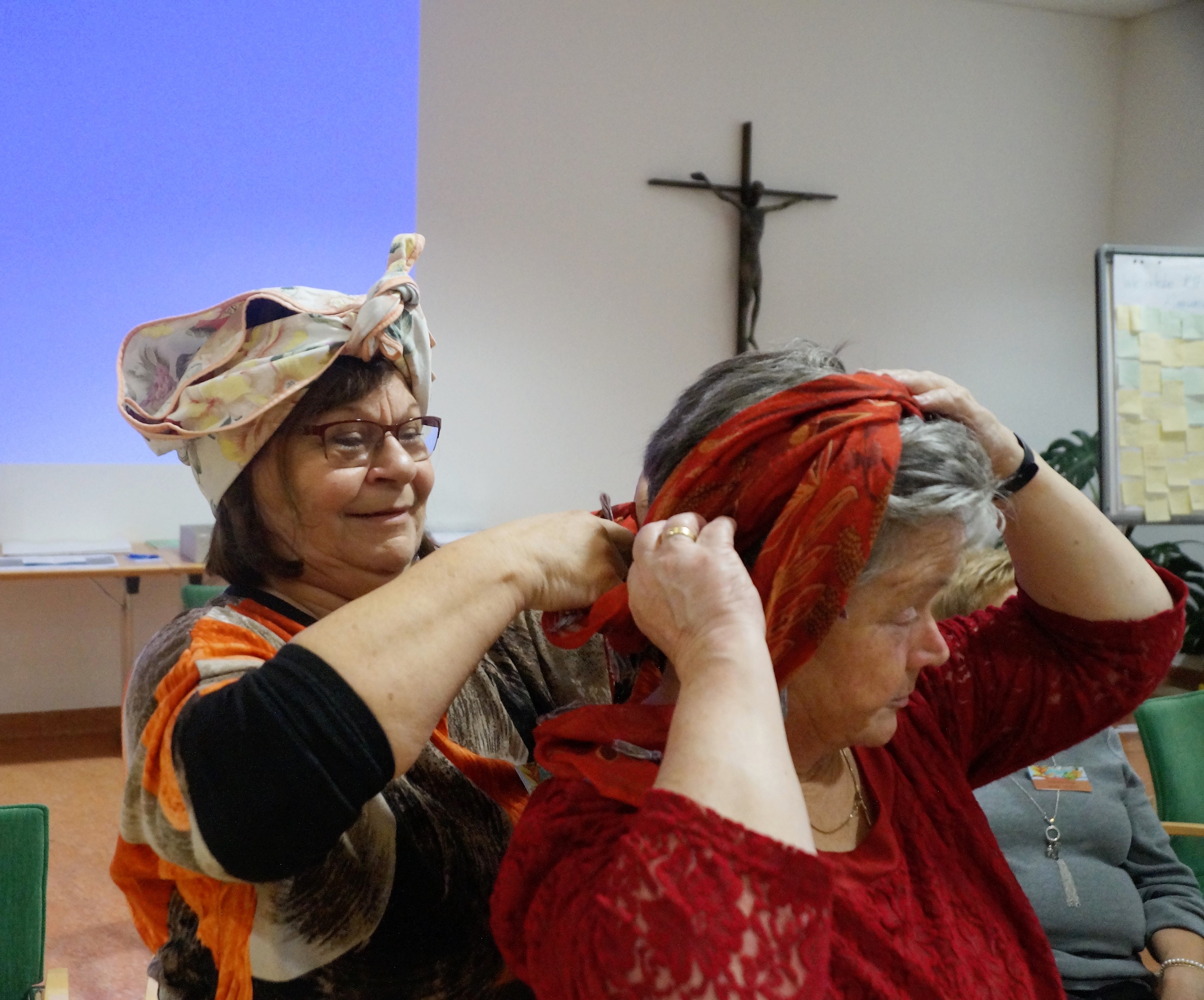 Der Samstagabend stand ebenfalls ganz im Motto des kommenden Schwerpunklandes. Es wurde getanzt und gefeiert. Besonderen Anklang fand das Kopftuchbinden der beiden Vorstandsfrauen Brigitte Hany und Brigitte Zinnburg. Die sogenannte Angisa, der traditioneller Kopfschmuck auf Surinam, kann unterschiedliche Bedeutungen haben. Lustig, und doch mit einem ernsten Hintergrund, empfanden die Frauen auch das Umweltspiel vom International Office in New York, das in Vierer-Gruppen gespielt wurde.