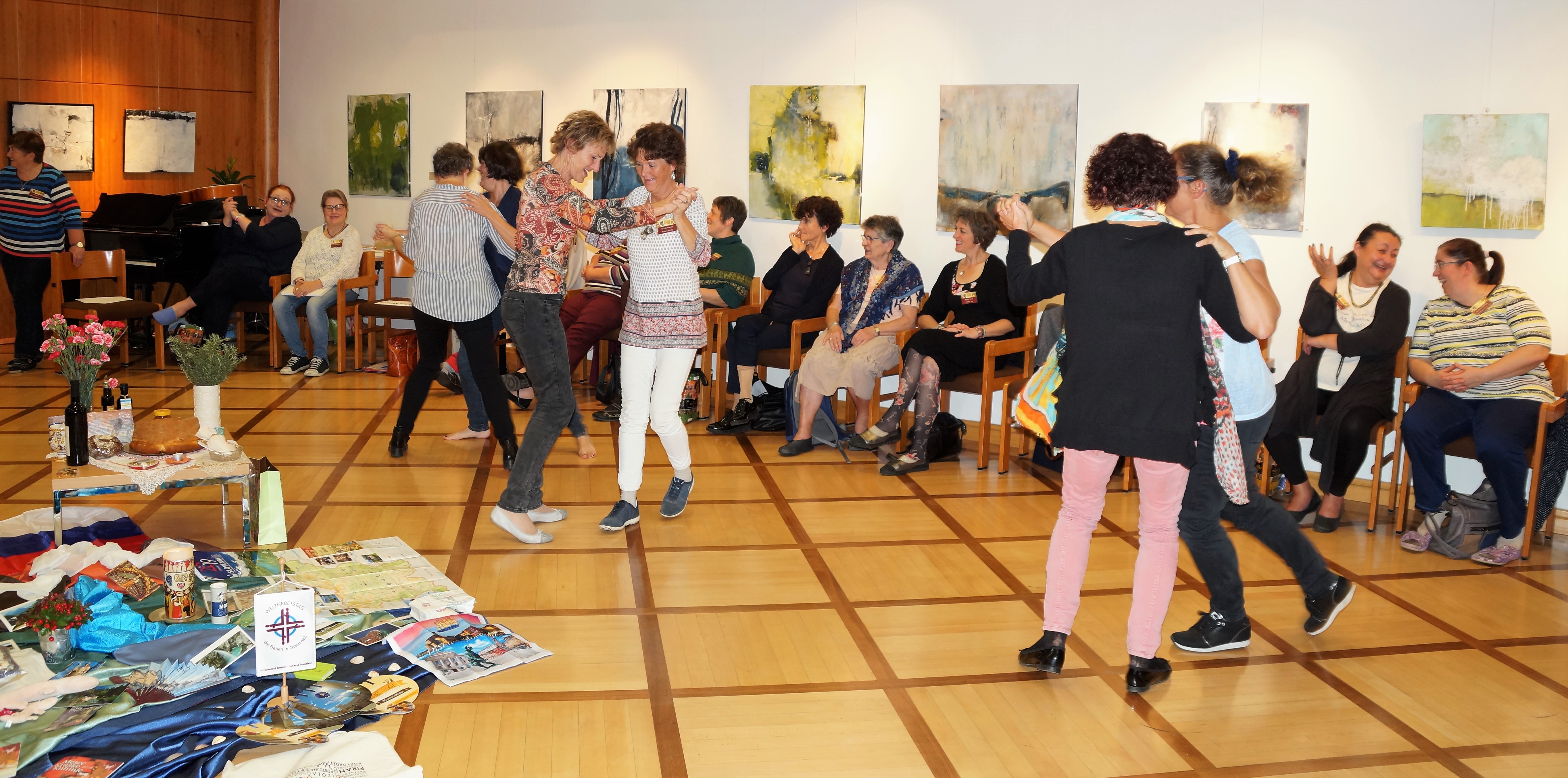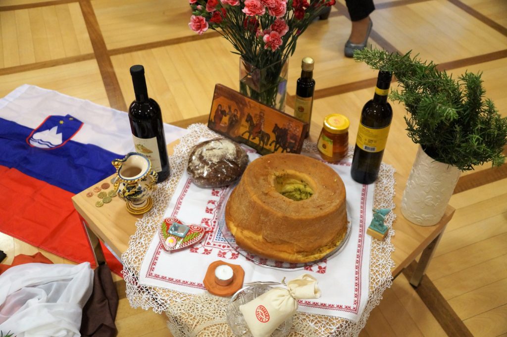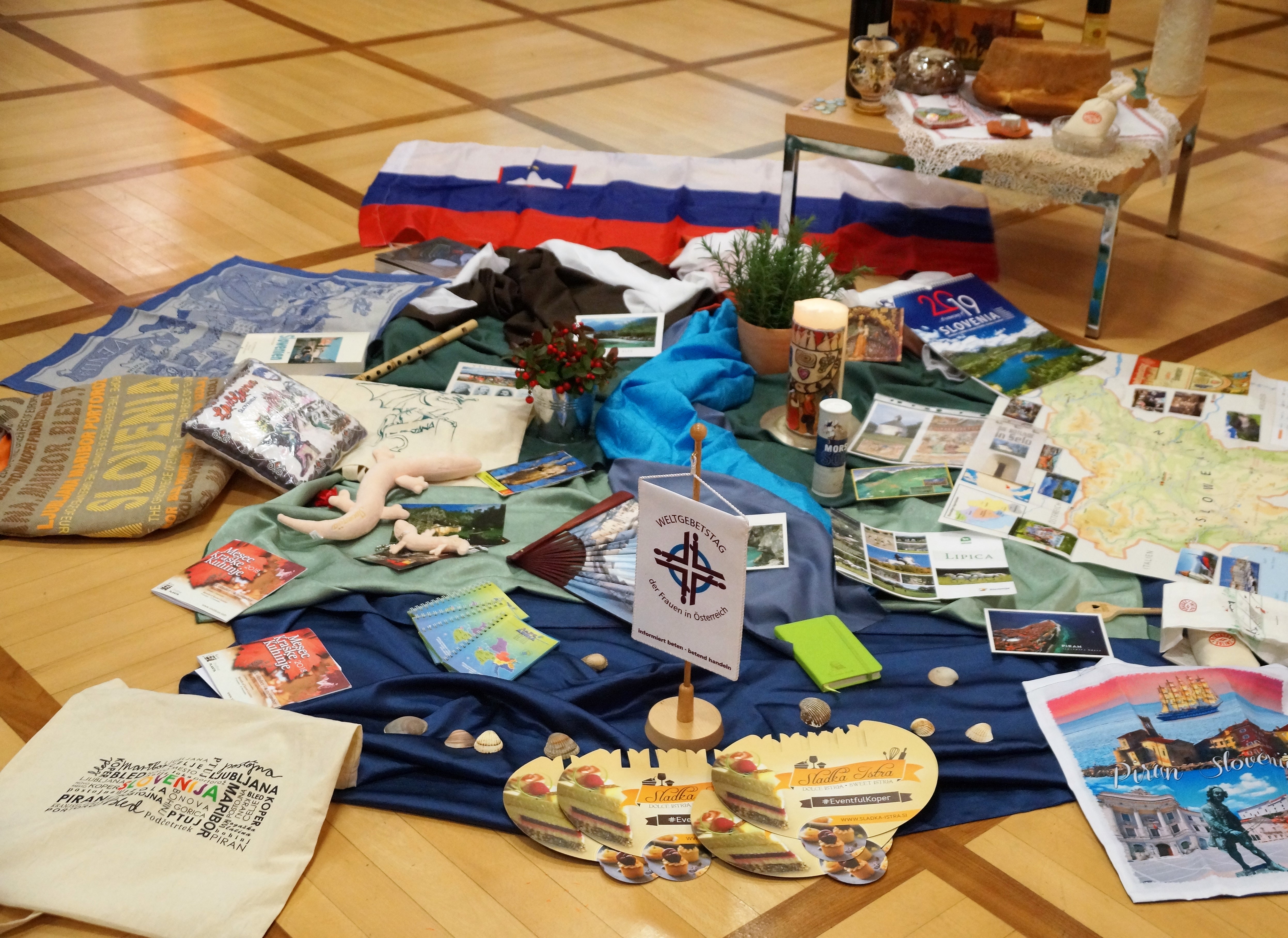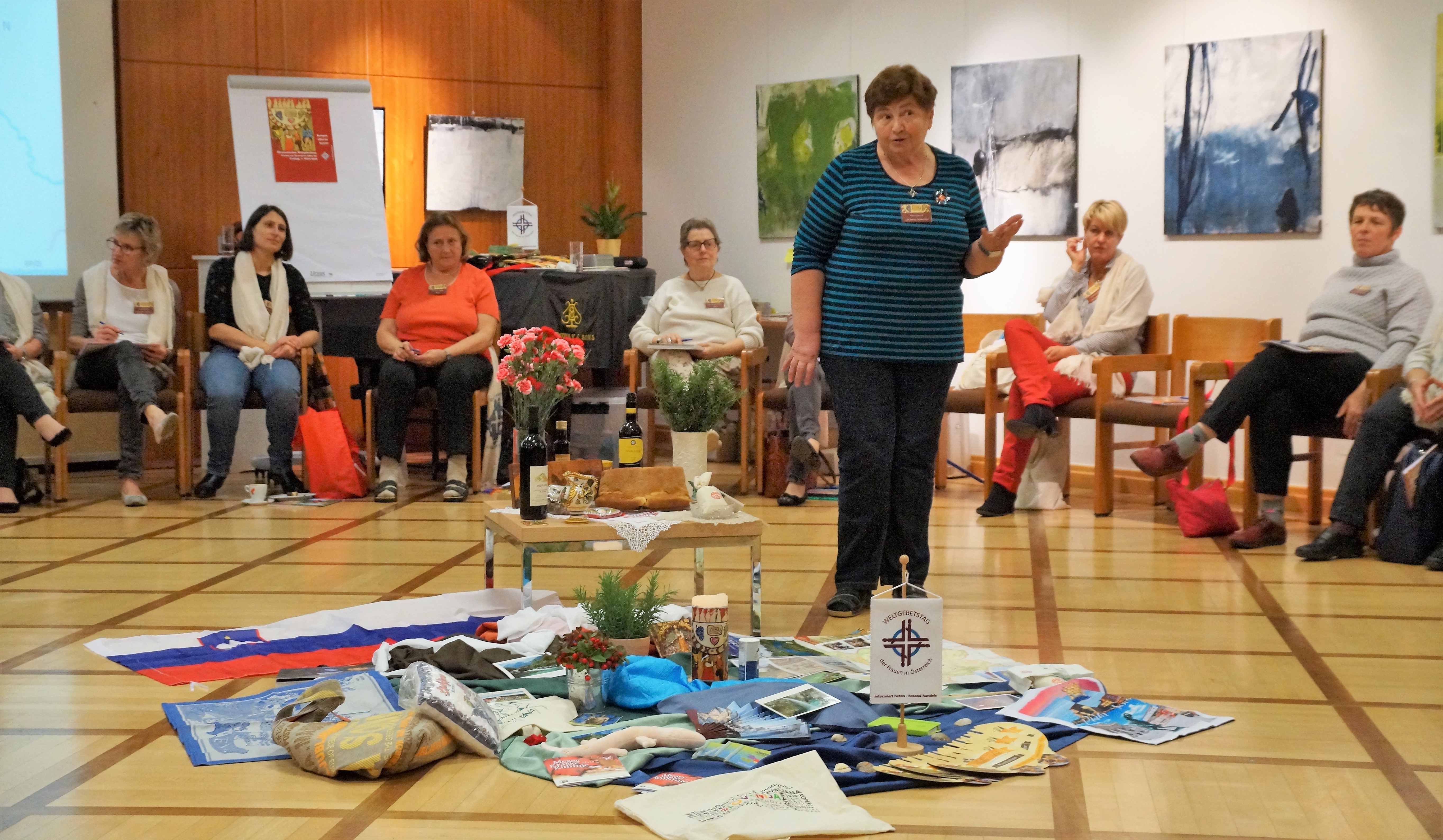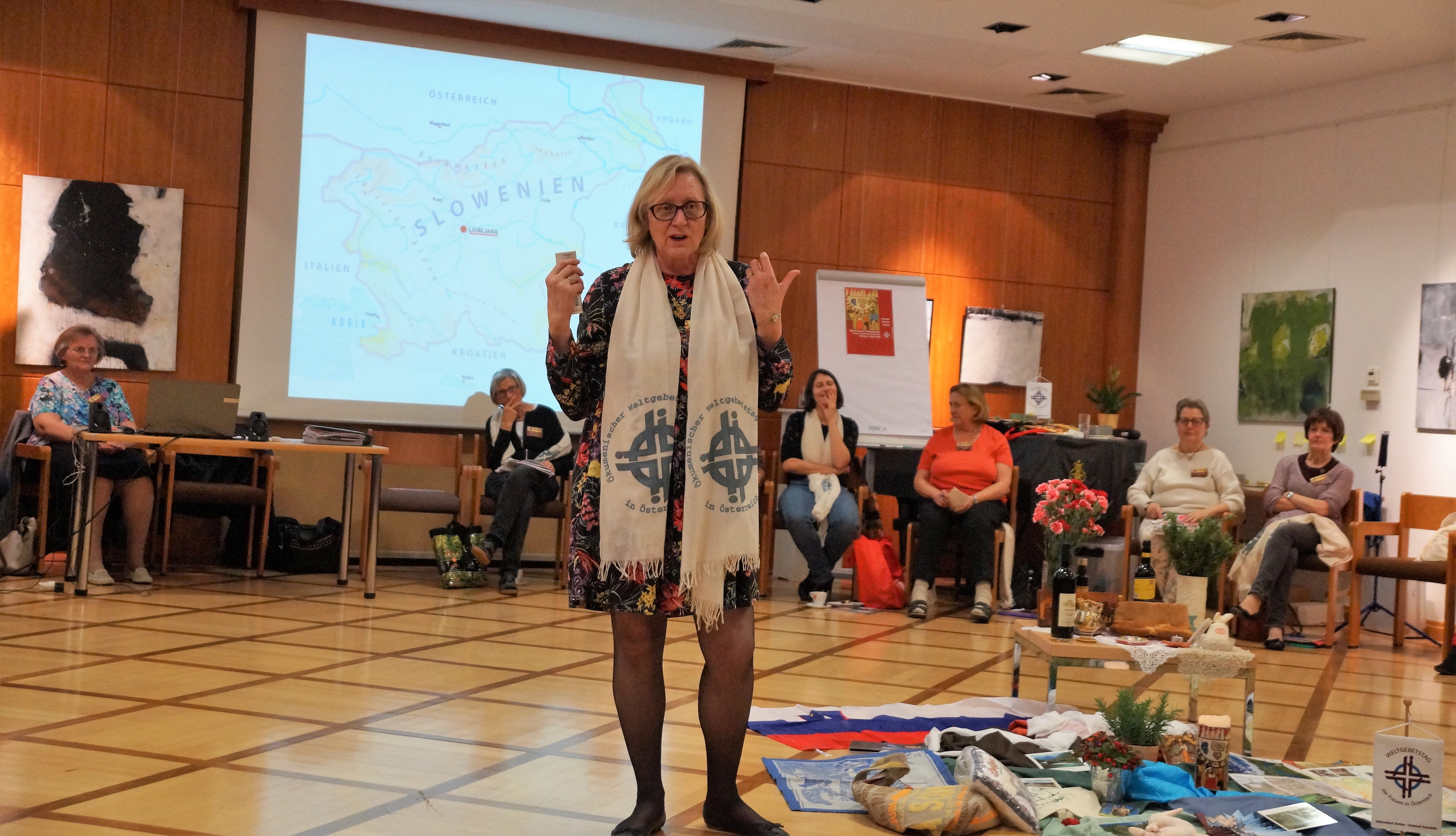 Elisabeth Papauschek und Brigitte Zinnburg brachten den Frauen das aktuelle Schwerpunktland Slowenien mit vielen Infos und Fotos näher. Vera Lamut brachte nicht nur interessante Erzählungen, sondern auch typisch slowenische Gegenstände mit, die für ein festliches Beisammensein in Slowenien unerlässlich sind. Vera deckte ein kleines Tischchen mit einem handbestickten Deckchen, darauf stellte sie den berühmten Potica (Festtagsgebäck), Wein, Honig, Brot und Salz. Auch bunt blühende Nelken, Rosmarin und ein mit Nelken verziertes rotes  Herz (licitar) sind symbolträchtige Gegenstände, die nicht fehlen dürfen. Mit viel Einfühlungsvermögen gestaltete die nahezu blinde Künstlerin Rezka Arnuš das diesjährige Titelbild. Frauen in ihren nationalen Trachten, der buntgedeckter Tisch mit Weintrauben und Potica (ein Festtagsgebäck) und die in warmen Farben dargestellten ausgegrenzten Menschen unterstreichen die Worte Jesu, die Armen und Blinden zum Festmahl einzuladen.