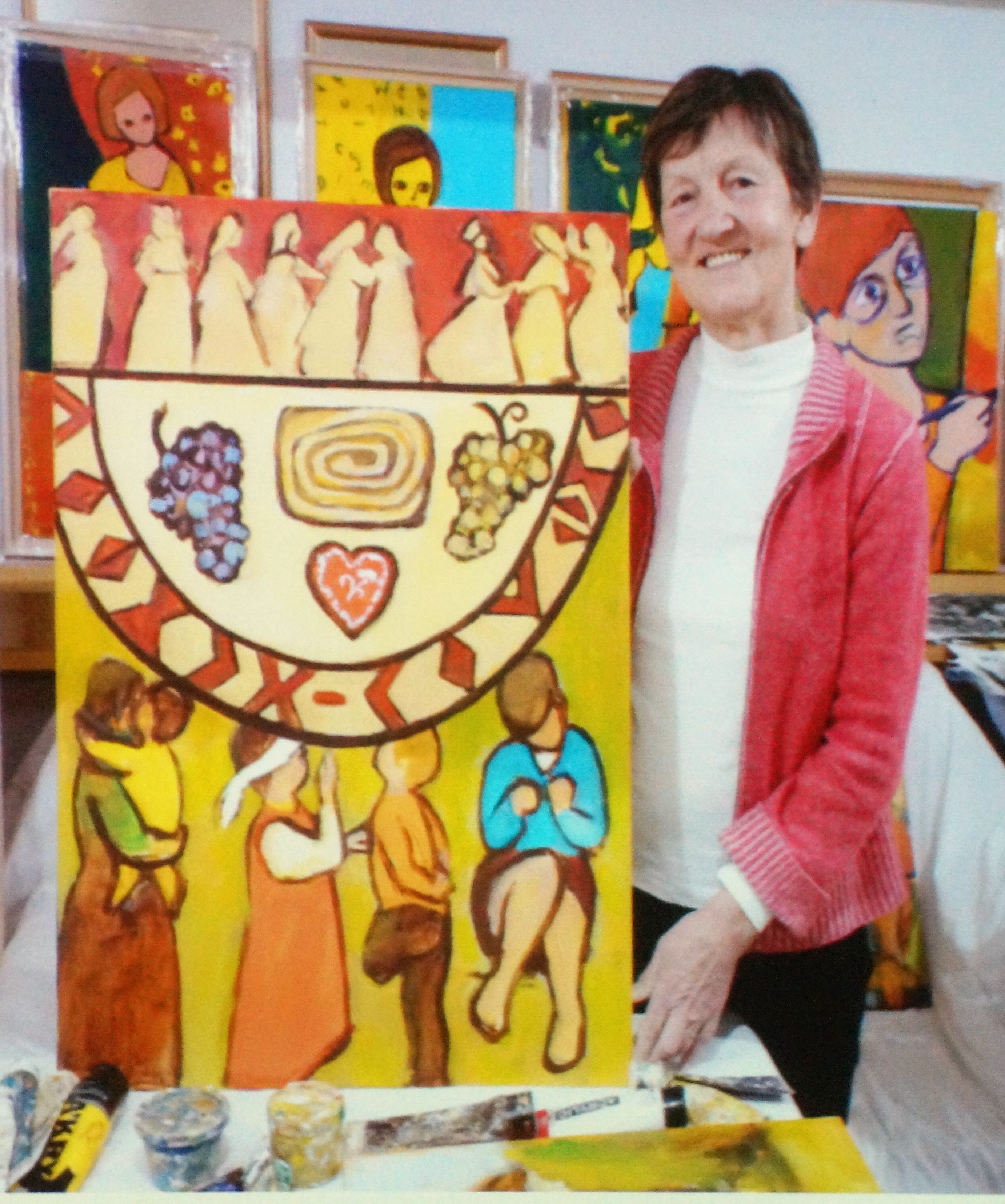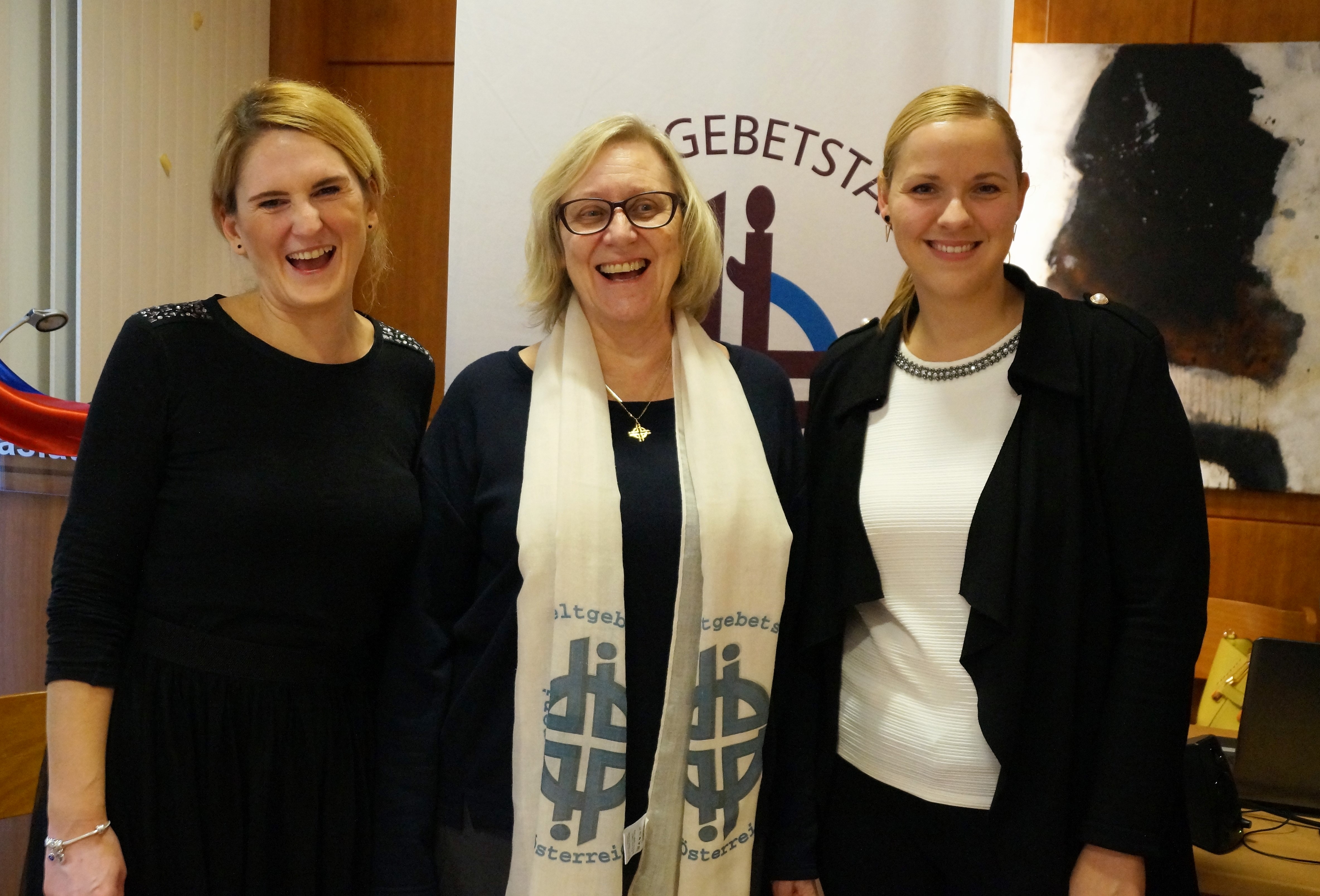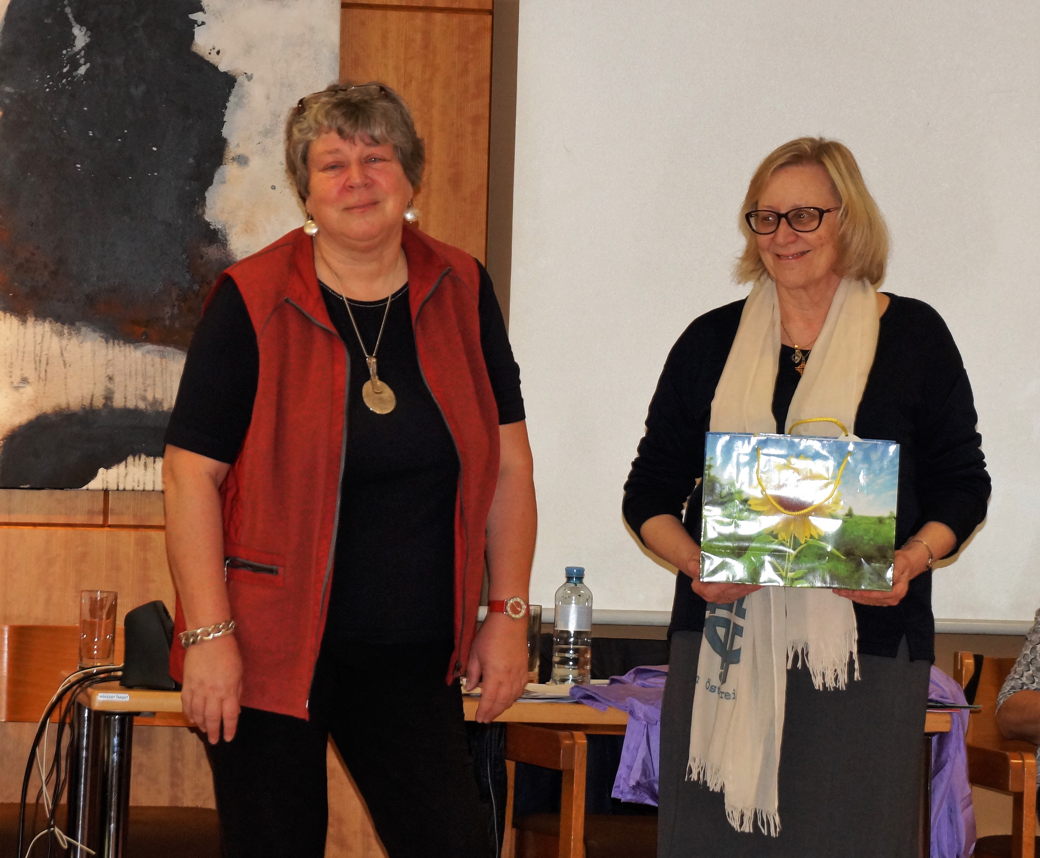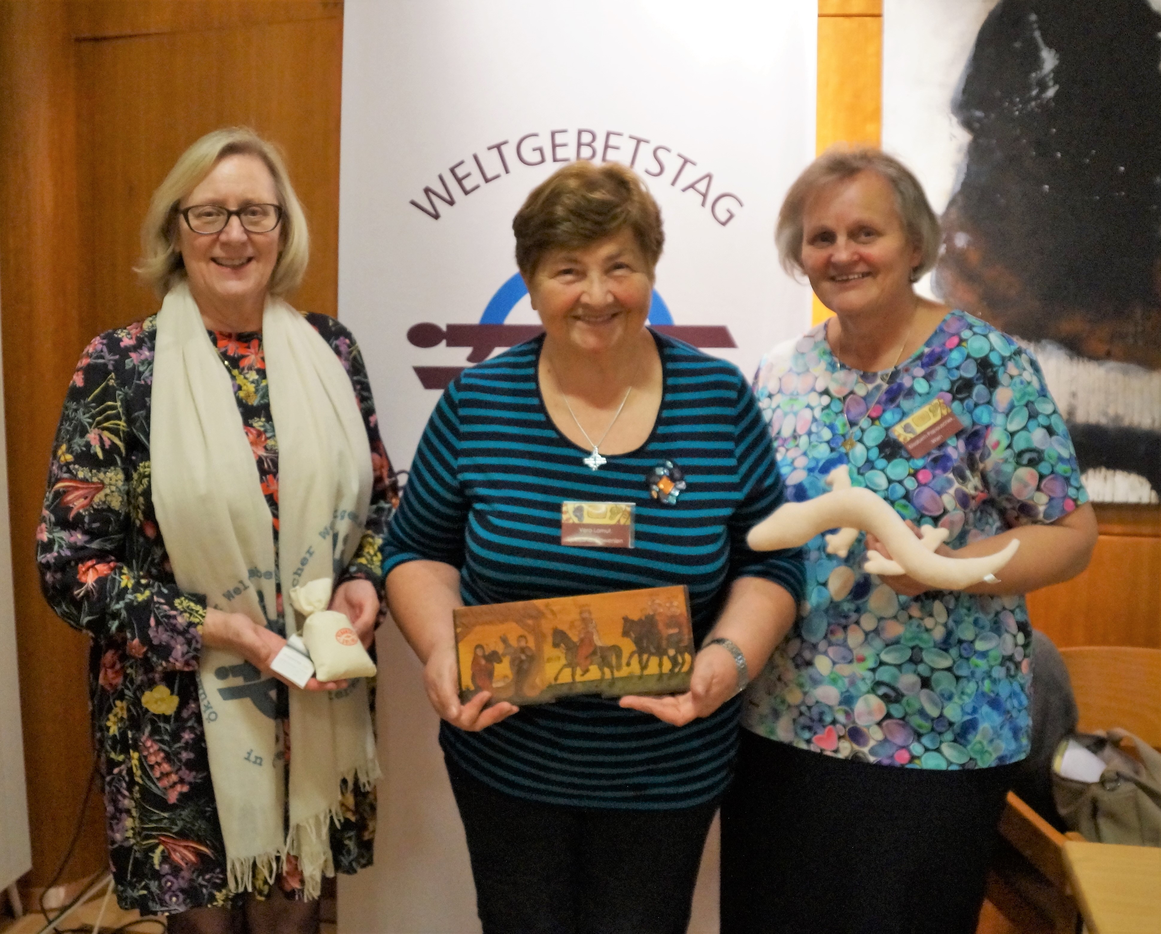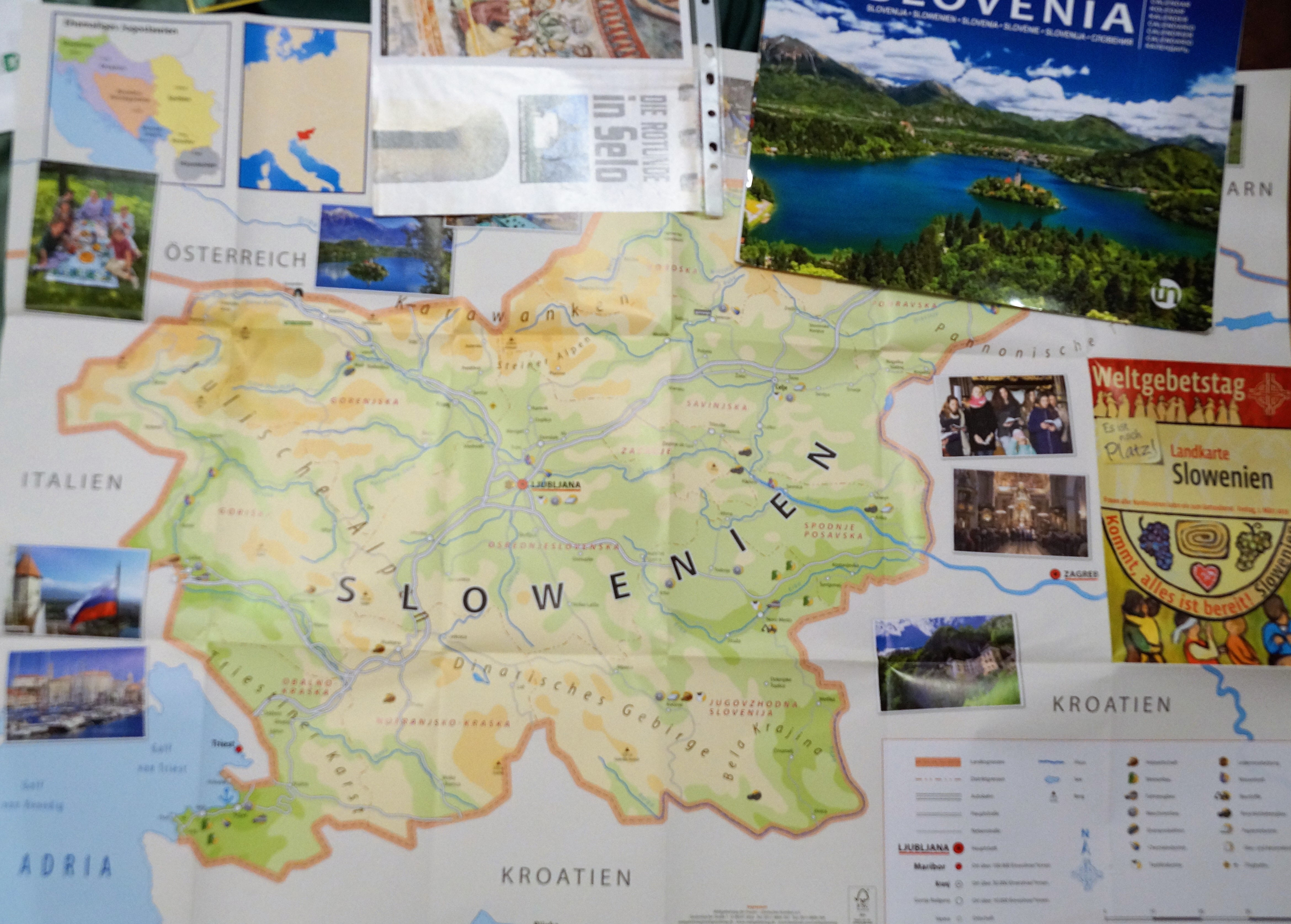 Elisabeth Papauschek und Brigitte Zinnburg brachten den Frauen das aktuelle Schwerpunktland Slowenien mit vielen Infos und Fotos näher. Vera Lamut brachte nicht nur interessante Erzählungen, sondern auch typisch slowenische Gegenstände mit, die für ein festliches Beisammensein in Slowenien unerlässlich sind. Vera deckte ein kleines Tischchen mit einem handbestickten Deckchen, darauf stellte sie den berühmten Potica (Festtagsgebäck), Wein, Honig, Brot und Salz. Auch bunt blühende Nelken, Rosmarin und ein mit Nelken verziertes rotes  Herz (licitar) sind symbolträchtige Gegenstände, die nicht fehlen dürfen. Mit viel Einfühlungsvermögen gestaltete die nahezu blinde Künstlerin Rezka Arnuš das diesjährige Titelbild. Frauen in ihren nationalen Trachten, der buntgedeckter Tisch mit Weintrauben und Potica (ein Festtagsgebäck) und die in warmen Farben dargestellten ausgegrenzten Menschen unterstreichen die Worte Jesu, die Armen und Blinden zum Festmahl einzuladen.